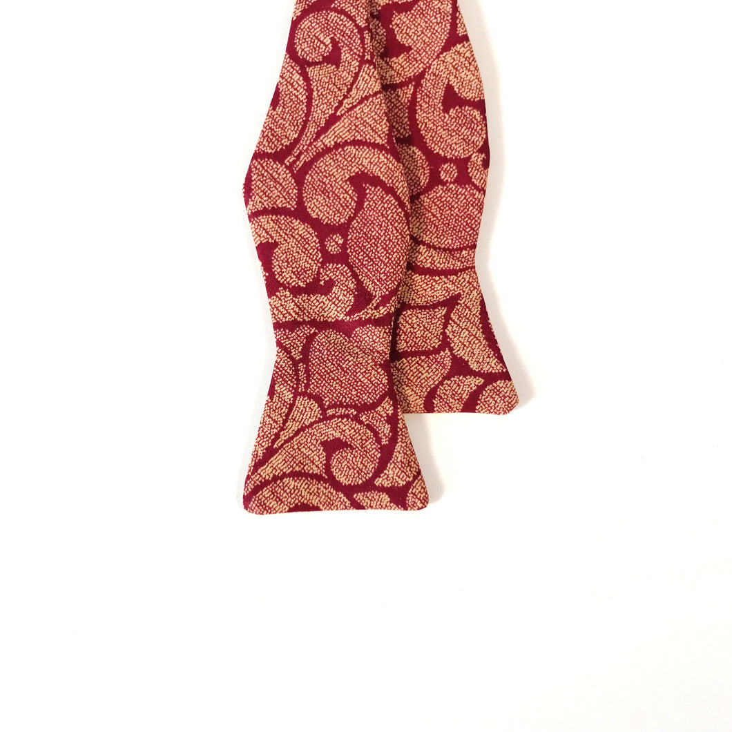 Refined Vanguards' ties are handmade in the USA. Each item will be unique due to its handcrafted nature. Every detail has been carefully executed resulting in a high quality with plenty of style. The Blakey bow tie is a burgundy large print paisley pattern bow tie with a butterfly design made of cotton fabric. This tie is exquisitely finished with a sizing tape and clasp allowing easy wear.