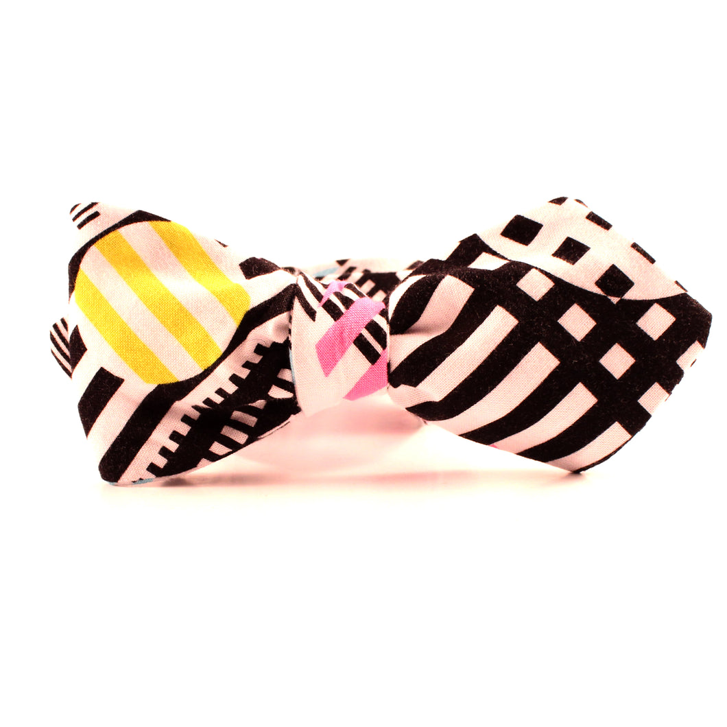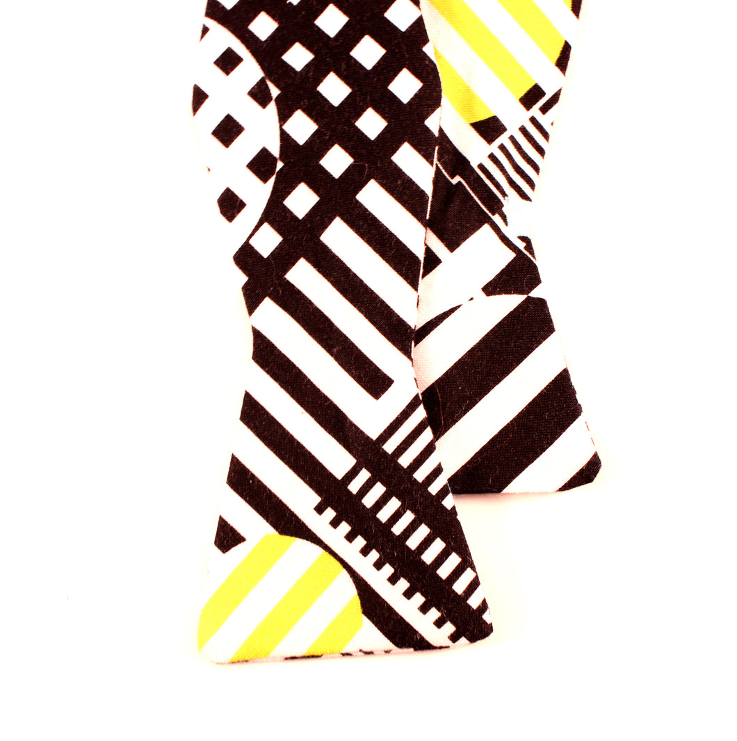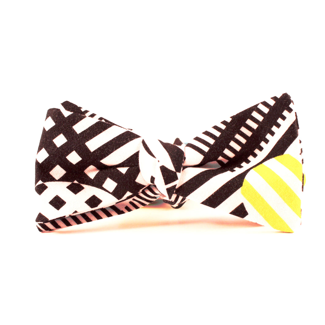 Refined Vanguards' bow ties are handmade in the USA. Each item will be unique due to its handcrafted nature.  Every detail has been carefully executed resulting in a high quality with plenty of style. The Eighty-eight bow tie is available in two styles, the butterfly and diamond. This black and white geometric print bowtie is exquisitely finished with a clasp allowing easy wear.