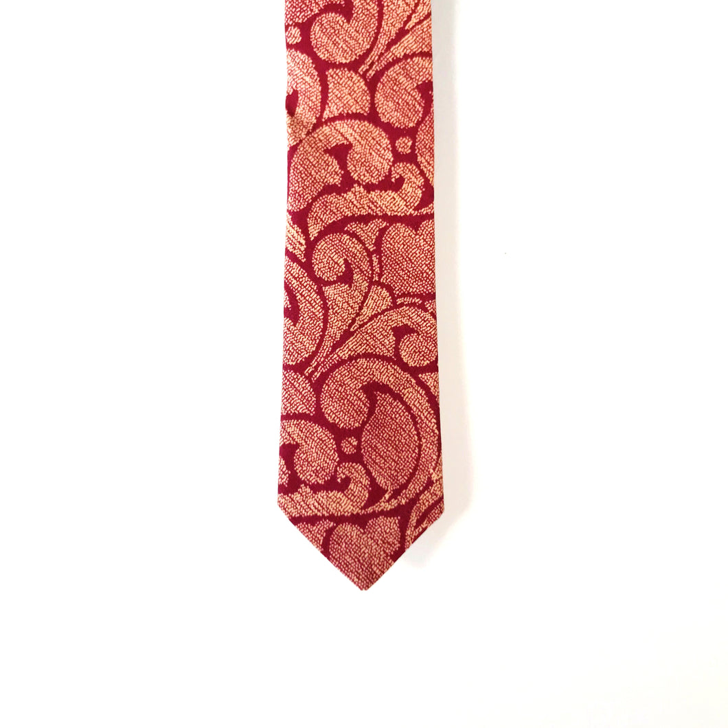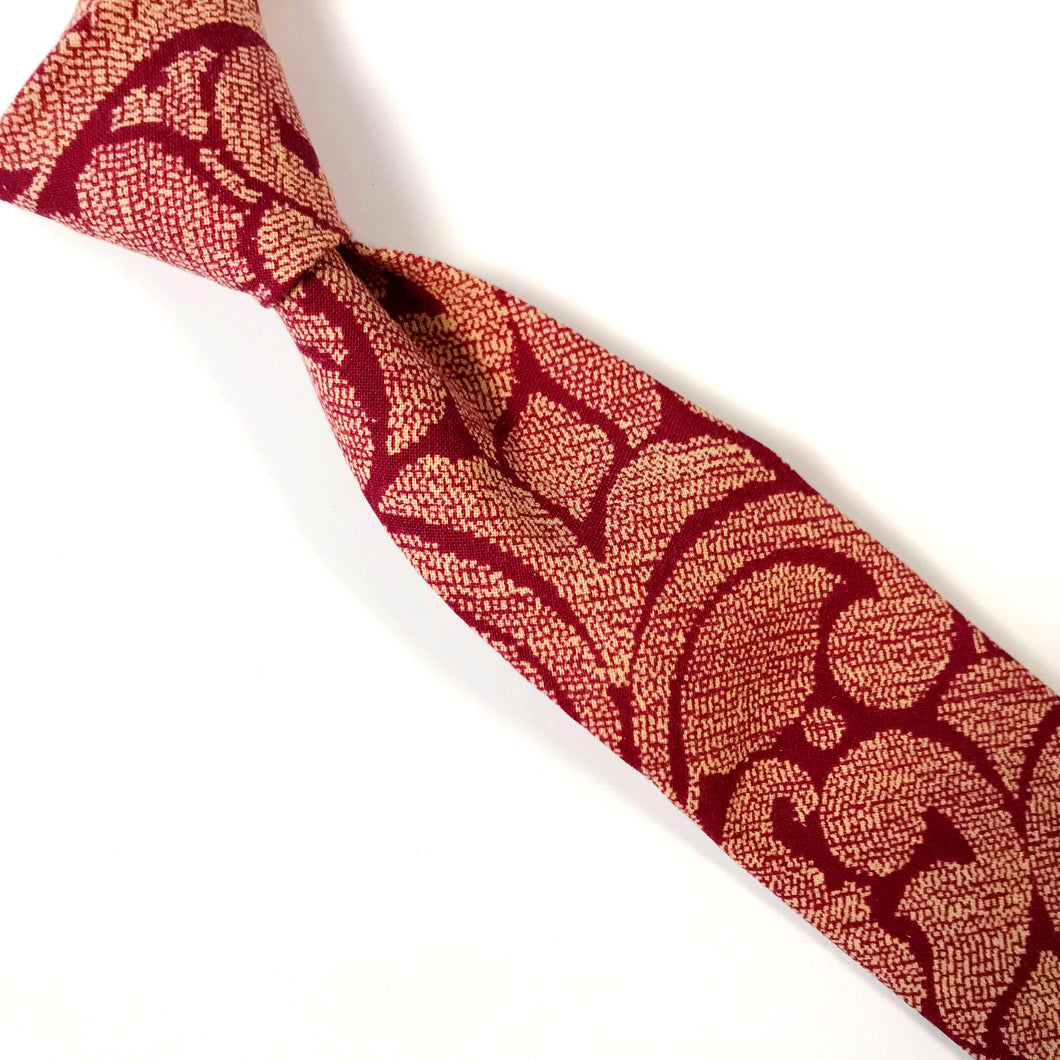 Refined Vanguards' ties are handmade in the USA. Each item will be unique due to its handcrafted nature. Every detail has been carefully executed resulting in a high quality with plenty of style. The Mandel is a burgundy large paisley print necktie made of cotton fabric. This tie is exquisitely finished with Navajo print tipping.