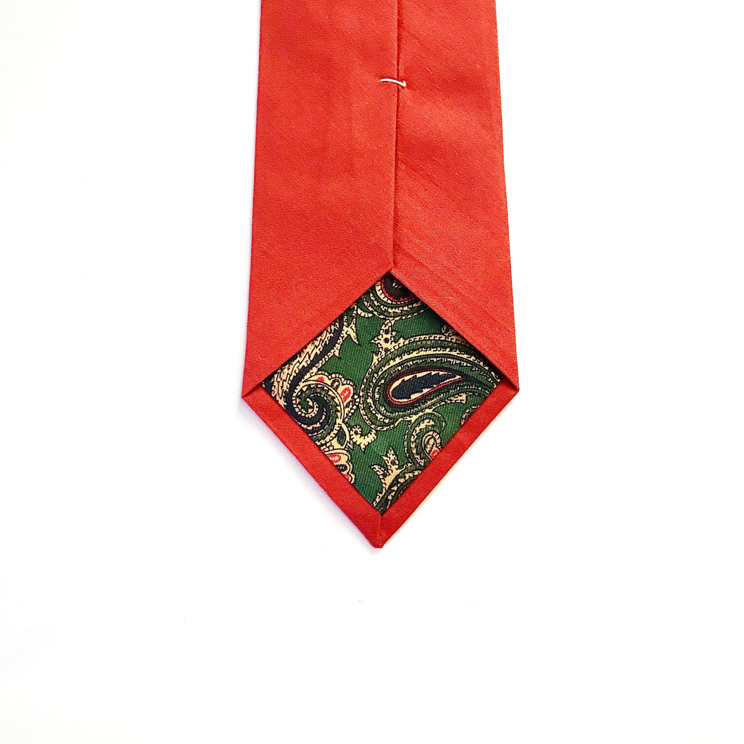 Refined Vanguards' ties are handmade in the USA. Each item will be unique due to its handcrafted nature. Every detail has been carefully executed resulting in high quality with a great deal of style. The Red Clay is an burnt orange necktie made from 100% cotton fabric. This tie is exquisitely finished with green multi-color tipping.